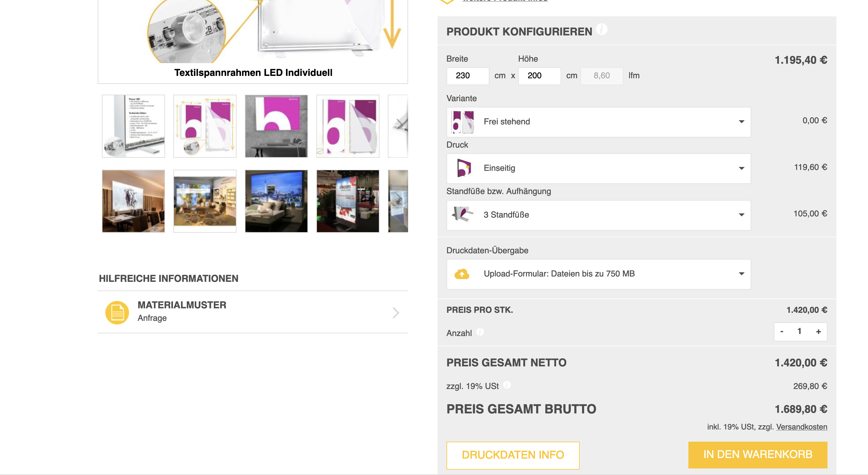 Im Anhang habe ich Dir den Leuchtrahmen mit Standfüßen im Sonderformat 2300 x 2000 mm angeboten.
