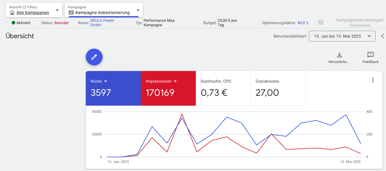 Diese laufen mit 25€ pro Tag, in der AB steht mindestens 20€ Tag. Die Empfehlung von Google Ads war 28€/Tag.