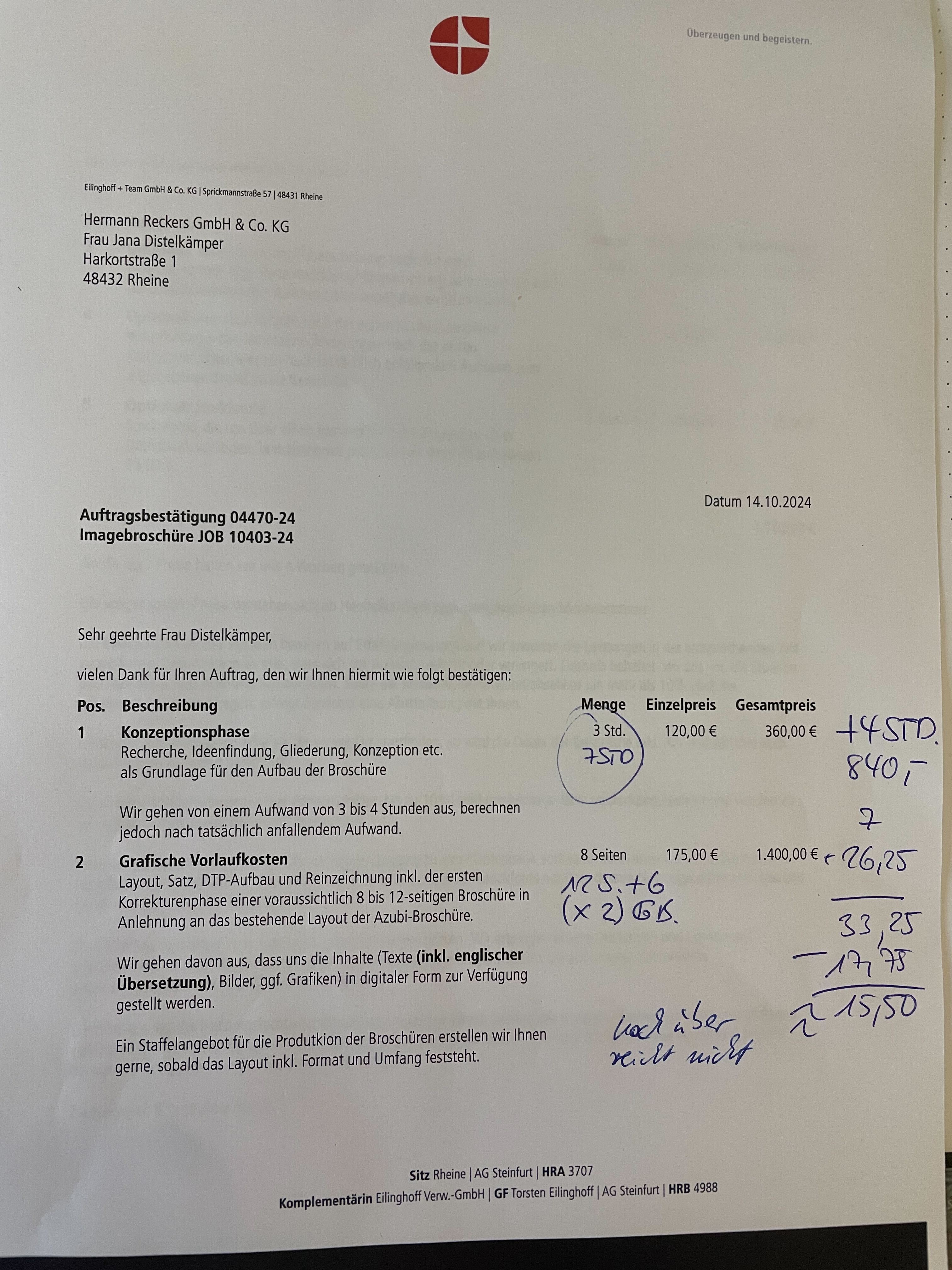 ich habe die Zeit genutzt und mir Ihr Angebot in Ruhe einmal angesehen. Grundsätzlich sieht das schon ganz gut aus und ich kann mir das so schon ganz gut vorstellen. Ein bisschen mehr Hilfe werde ich wohl doch bei der Text und Bilddarstellung brauchen damit das wirklich was tolles und ansehnliches wird. Außerdem gefällt mir die Ausbildungsbroschüre zwar schon richtig gut, sie erfüllt absolut ihren Zweck, aber für unsere Imagebroschüre sollten wir designtechnisch noch eine Schüppe drauflegen, aber ich bin mir sicher, dass Sie da gute Ideen haben. Vielleicht auch, was andere Firmen da so machen?