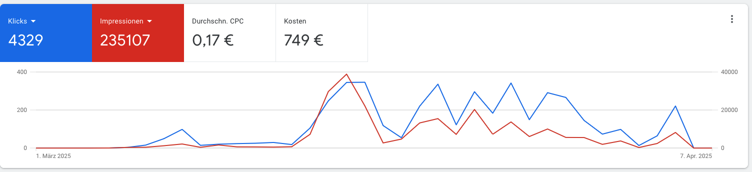 Werte oder Conversions der Anzeige können wir leider nicht beurteilen, da wir kein Tracking auf der Seite eingebaut haben, da uns der Zugang dazu fehlt.