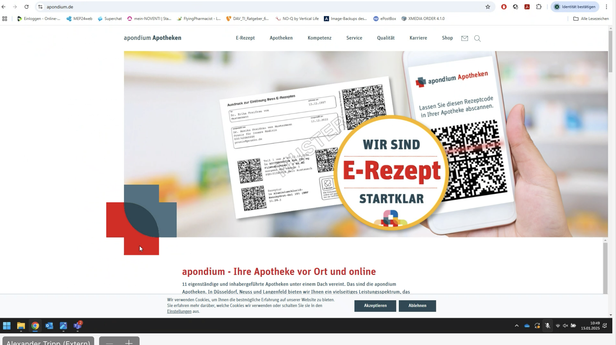 TE, tel. mit Alexander Tripp am 19.2.25: Will zunächst das Angebot Markenauftritt mit uns umsetzen. Ob es dann eine Webseite auf Basis einer Hamburger Firma (Pharma Privat) mit App-Funktion für die Einreichung der Rezepte (Card-Link) gibt oder wir die Funktionen auf einer von uns erstellten Webseite einbinden muss noch geklärt werden. Alexander sendet mir sowohl per Mail Infos zu Pharma-Link und der App ApoGuide von Gedisa-Verband zu, damit wir uns im Vorfeld damit beschäftigen können. Termin mit Begehung der Apotheken in Dormagen wird dann in der zweiten Märzwoche sein. Zu klären ist noch, wie grundsätzlich dann eine Webseitenstruktur für die drei Apotheken aussehen kann. Hierzu sollten wir zum Termin eine Übersicht vorbereiten.