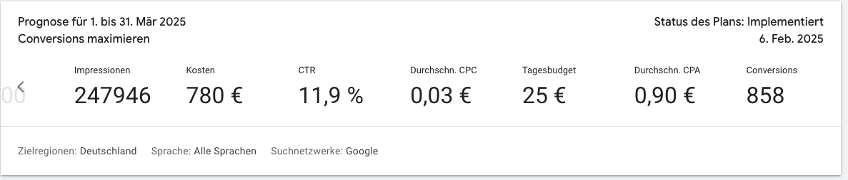 Ergänzend zu den Angeboten habe ich auch eine Google Prognose zur voraussichtlichen Zielgruppe angefügt, den CPC und Conversions angefügt.