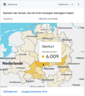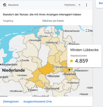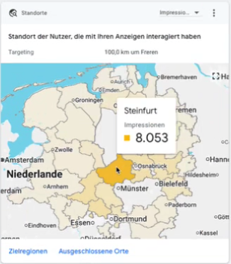Außerdem habe ich Ihnen noch zwei Charts angefügt. Hier sehen Sie, aus welchen Regionen die meisten Impressionen kamen: 8.053 für Asbest aus Steinfurt und für die Anzeige Tiertransporte Neben Steinfurt mit 6.009 auch Minden-Lübbecke mit 4.859 Impressionen.